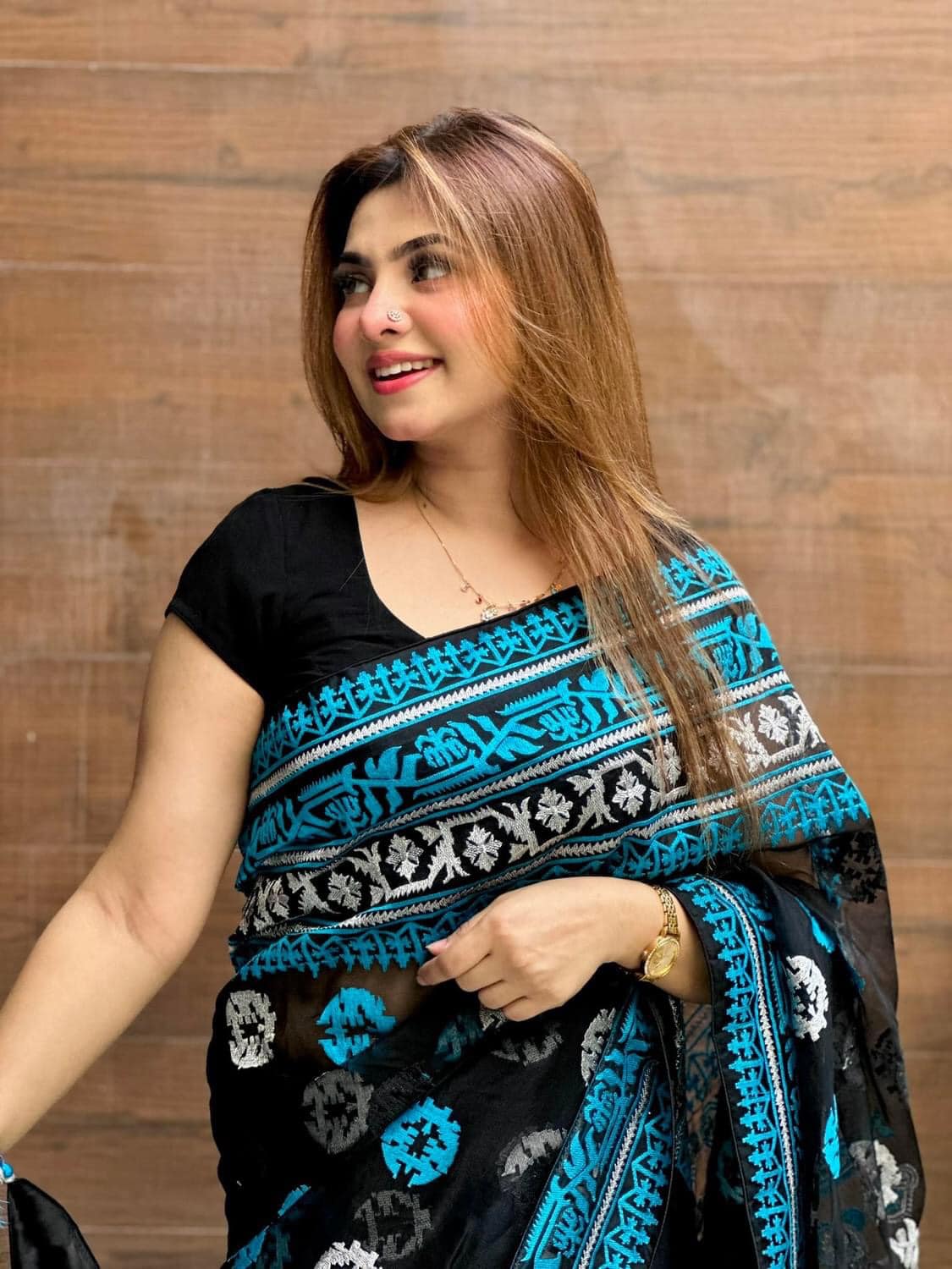 ছাড়জামদানী ইন্সপায়ার্ড জাপানি সিল্ক স্কিন ও এম্বুস প্রিন্ট শাড়ি।