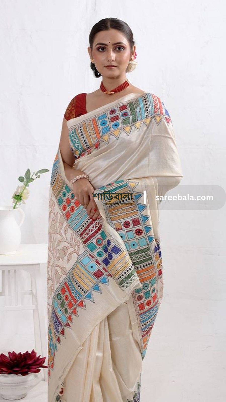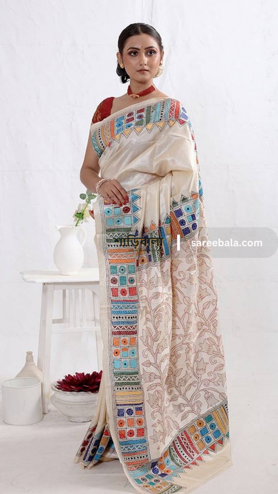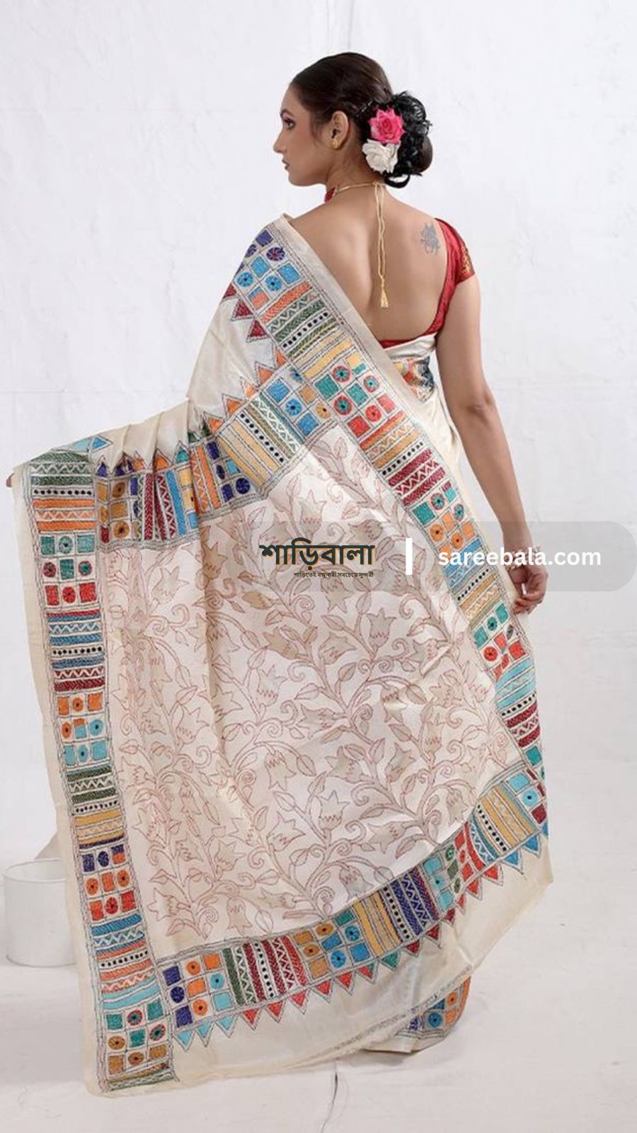 Cream Kantha Stitch Print Pure Silk Saree With Blouse Piece | DG-127